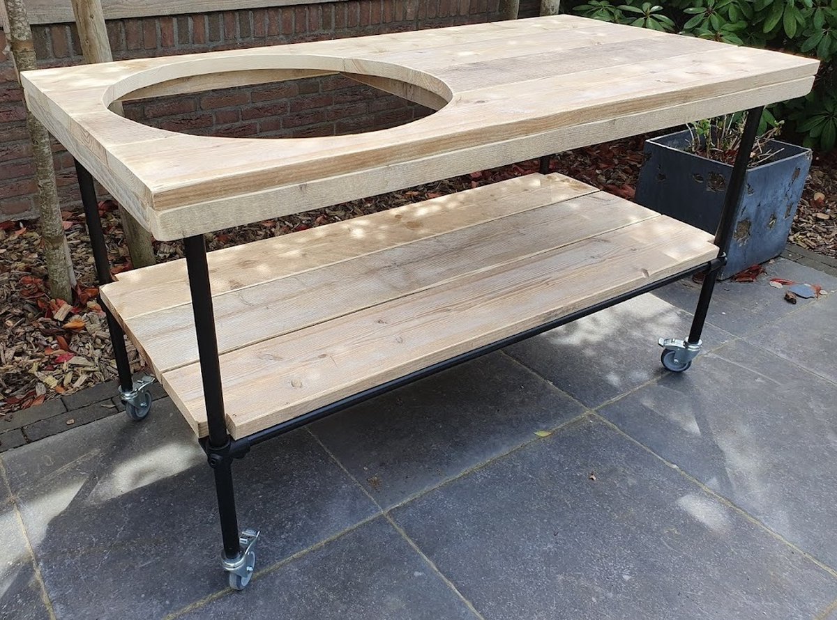 Mooie industriële tafel gemaakt van zwart gecoate buizen 26.9mm met echte gebruikte steigerplanken. Deze buitenkeuken is voorzien van 4 wielen met rem wat hem zeer praktisch maakt!