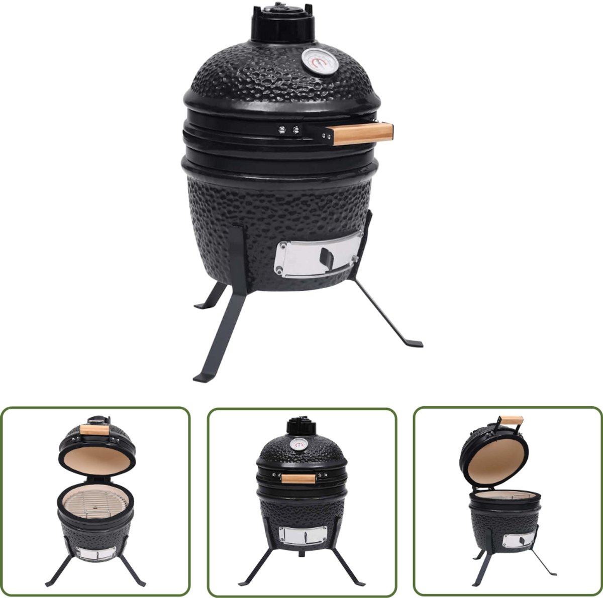 De keramische barbecue heeft een zeer stevig scharnierend deksel met ventilatieopening en een ingebouwde thermometer. Dankzij de gelaagde ventilatieopening kan je zowel de luchtstroom als de temperatuur makkelijk regelen. Het hoogwaardige keramiek met kuiltjes-structuur en geglazuurde afwerking is duurzaam en esthetisch aantrekkelijk. De grill zorgt voor een uniek kookproces dat smaak aan het eten toevoegt en het tegelijkertijd uitzonderlijk mals houdt! De gepoedercoat stalen poten voegen extra stabiliteit toe aan de grill.