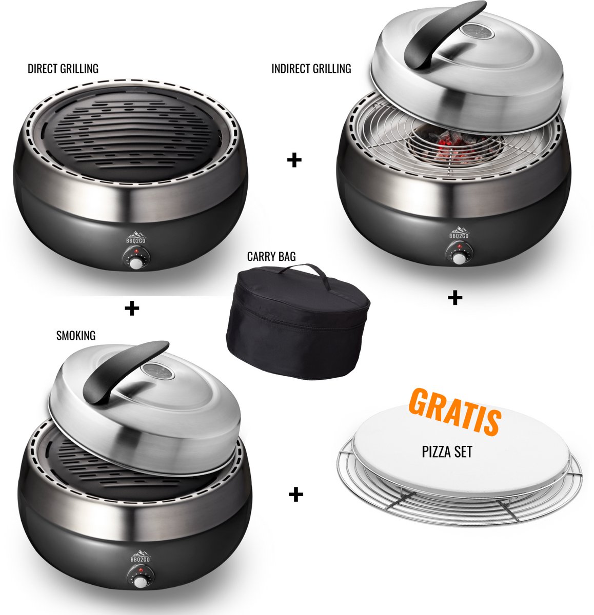 BBQ2GO SET2025 – Rookvrije Houtskool Tafelbarbecue – Direct en Indirect grillen en smoken, GRATIS Pizzaset & Draagtas – Ø30cm