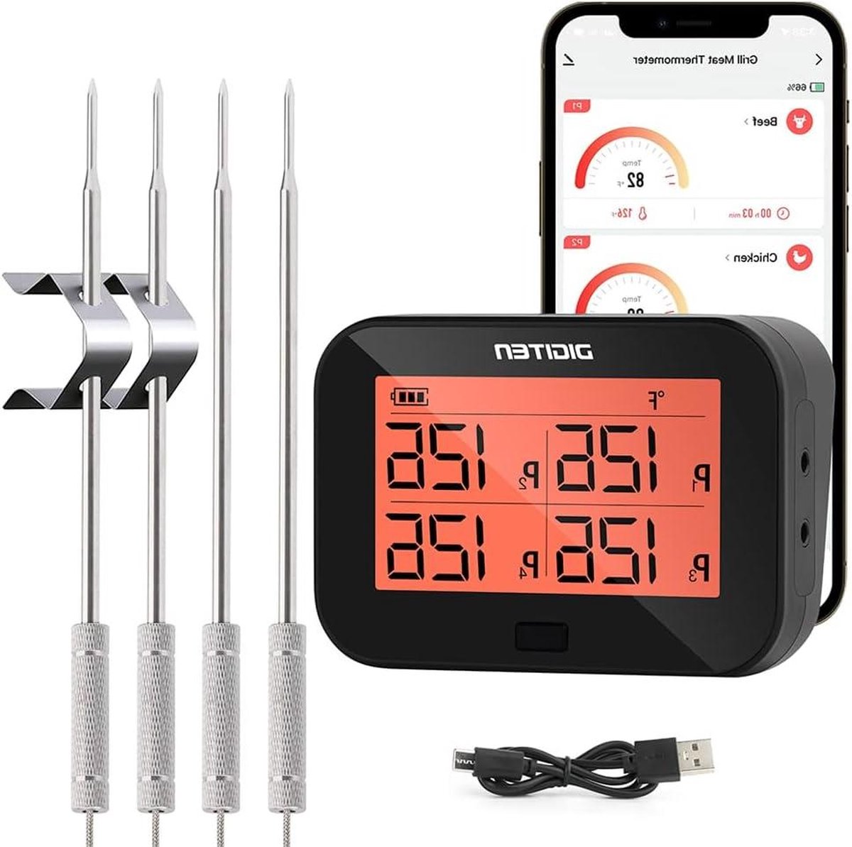 Vleesthermometer – Bluetooth Grillmet 4 Sondes – Directe Aflezing – Temperatuuralarmfunctie – Voedselthermometer voor Keuken – Rundvlees – Snoep – Kaas