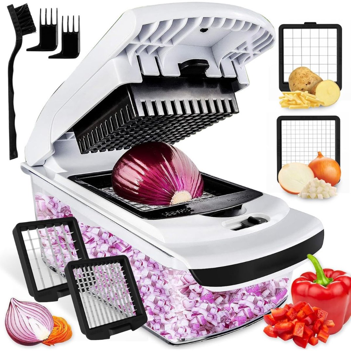 Ben jij het zat om eindeloos te snijden, te hakken en te versnipperen, terwijl de tijd wegtikt en je vingers gevaar lopen? Maak kennis met de Groentesnijder – Mandoline Cutter – Hakmolen – Uiensnijder Wit – jouw ultieme keukenhulp die moeiteloos groenten snijdt, hakt en in blokjes verdeelt. Met zijn vlijmscherpe 420 roestvrijstalen messen bespaar je niet alleen tijd en energie, maar geniet je ook van perfect gesneden ingrediënten in een handomdraai. Of je nu aardappelen, tomaten, komkommers of wortelen snijdt, deze groentesnijder maakt koken efficiënter én leuker.