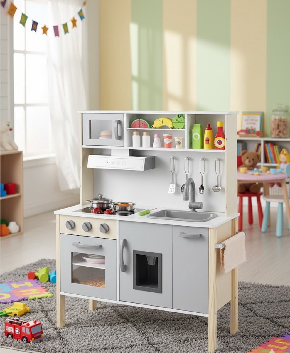 Laat de creativiteit van je kind tot leven komen met de Premium Houten Kinderkeuken van Meda Home Store. Deze moderne speelkeuken is ontworpen om urenlang speelplezier en leerervaring te bieden. Met realistische details, veilige materialen en een elegant grijs design past deze keuken perfect in elke kinderkamer of speelruimte.