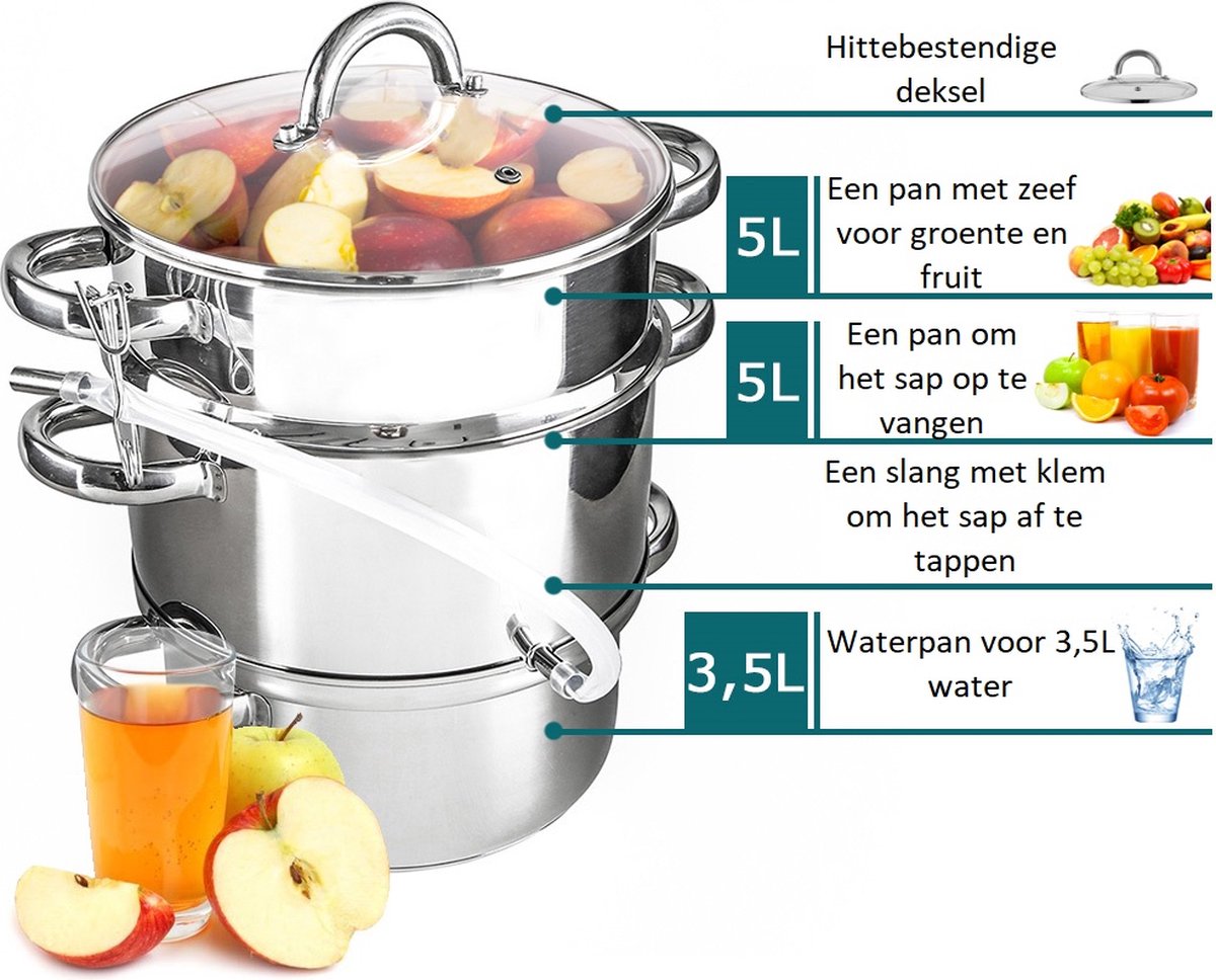 Bent u ook opzoek naar een nieuwe sap maker maar wil je niet een groot elektrisch apparaat in je keuken? Dan is deze sapcentrifuge pan wat voor jou! Met 3 pannen bovenop elkaar inclusief deksel maak je de lekkerste sappen gewoon op je fornuis. De pan is geschikt voor elke warmtebron dus iedereen kan hem gebruiken. De aftapslang met klem is ideaal om je vers gemaakte sappen van groente en fruit af te tappen in kleinere flessen of potten.