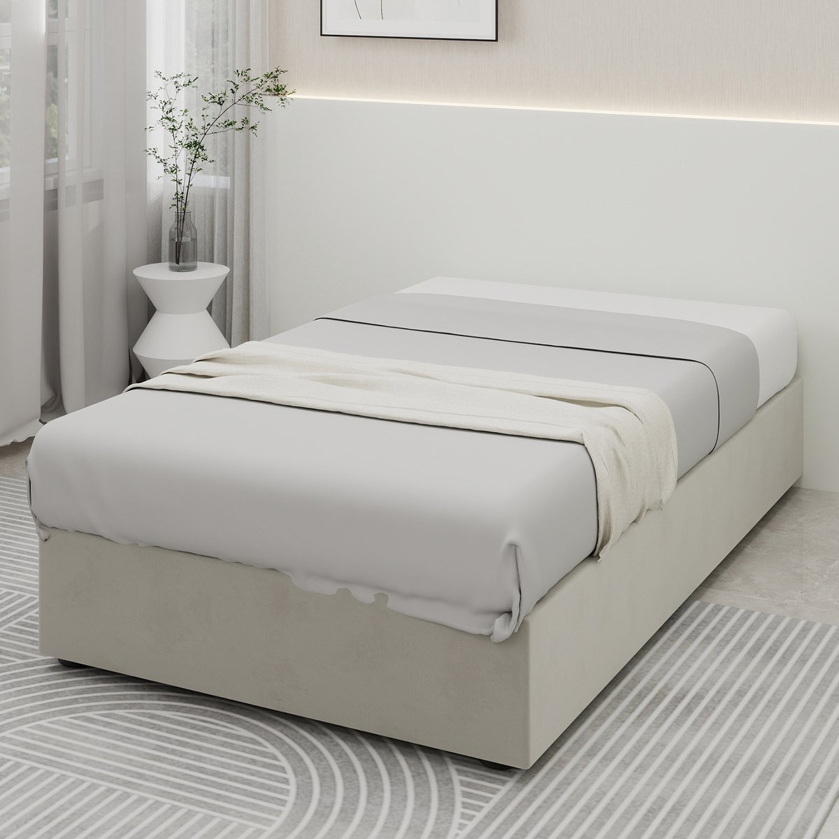 Het bed beschikt over een eenvoudige gaslift-opslag onder het bed, ideaal voor het opbergen van beddengoed, dekens en speelgoed, waardoor de ruimte optimaal wordt benut.