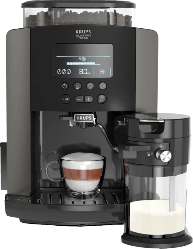Met de Krups EA819E Quattro Force zet je een lekkere kop koffie of cappuccino met één druk op de knop. Je bedient de machine gemakkelijk via druktoetsen en het lcd scherm. Hierop bepaal je de sterkte en hoeveelheid per kopje koffie. Je kiest uit 3 verschillende sterktes of uit 3 verschillende maalinstellingen. Hoe fijner de maling is, des te krachtiger de koffie. Je slaat tot 4 recepten op. Zo bespaar je tijd en geniet je snel van jouw favoriete koffie. Je zet melkspecialiteiten via het melkreservoir. Deze spoel je na gebruik gemakkelijk om. Is de machine toe aan een onderhoudsbeurt? Dan krijg je automatisch een seintje. De zetgroep van deze koffiemachine reinigt zichzelf met een automatisch programma.