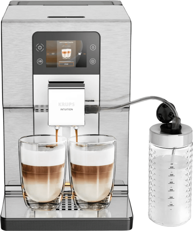 Stel je eigen koffierecepten samen en sla deze op met de Krups Intuition Experience EA877D. Wissel tussen de 8 gebruikersprofielen en sla dranken op voor je familie of vrienden. Je zet met dit apparaat gemakkelijk 2 espresso’s, maar ook 2 melkspecialiteiten tegelijkertijd. Bij melkspecialiteiten plaats je de melkslang in het melkreservoir of een pak melk. Het touchscreen bedieningspaneel begeleidt je stap voor stap door het zetproces. Zo zet je gemakkelijk een kop koffie naar wens. De roestvrijstalen behuizing is steviger dan een behuizing van kunststof. Zo gaat deze koffiemachine extra lang mee. Wanneer het tijd is voor onderhoud, geeft het apparaat een seintje. De machine spoelt automatisch na iedere zetbeurt.