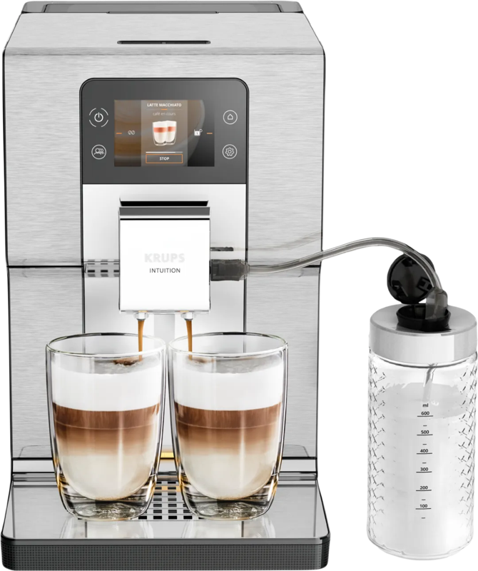 Stel je eigen koffierecepten samen en sla deze op met de Krups Intuition Experience EA877D. Wissel tussen de 8 gebruikersprofielen en sla dranken op voor je familie of vrienden. Je zet met dit apparaat gemakkelijk 2 espresso’s, maar ook 2 melkspecialiteiten tegelijkertijd. Bij melkspecialiteiten plaats je de melkslang in het melkreservoir of een pak melk. Het touchscreen bedieningspaneel begeleidt je stap voor stap door het zetproces. Zo zet je gemakkelijk een kop koffie naar wens. De roestvrijstalen behuizing is steviger dan een behuizing van kunststof. Zo gaat deze koffiemachine extra lang mee. Wanneer het tijd is voor onderhoud, geeft het apparaat een seintje. De machine spoelt automatisch na iedere zetbeurt.