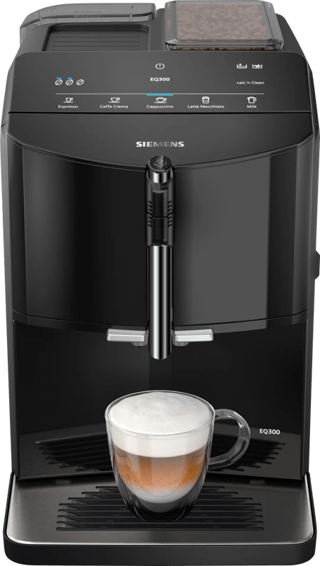 De Siemens EQ300 TF301E09 Piano Black heeft een uitschuifbare stoompijp die automatisch melkspecialiteiten voor jou opschuimt. Hiervoor vul je eerst jouw kopje met melk. Daarna schuimt de machine de melk voor je op. Vervolgens voegt het apparaat er een shot espresso aan toe. Je bedient de koffiemachine via de handige drukknoppen. Zo kies je uit een espresso, cappuccino, latte macchiato en een functie voor melk. Je kiest per koffiespecialiteit de sterkte uit. Zo drink je ’s ochtends een sterke koffie en ’s avonds een mildere. Je opent de koffiemachine aan de voorkant. Zo haal je gemakkelijk de zetgroep eruit voor het schoonmaken. Je klikt de stoompijp van de machine en reinigt hem in de vaatwasser.
