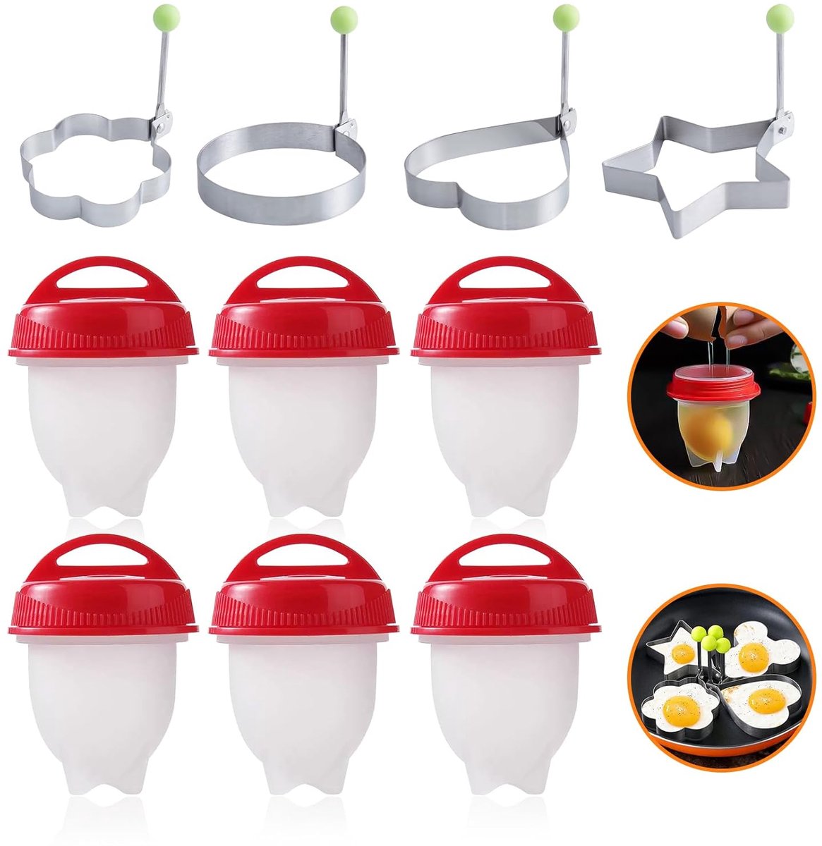 Maak Perfecte Eieren met Onze Siliconen Eierkoker Met de siliconen eierkoker bereid je op een eenvoudige en effectieve manier perfect gekookte eieren. Deze set bevat zes stuks, waaronder vier roestvrijstalen eierringen voor een optimale kookervaring.
