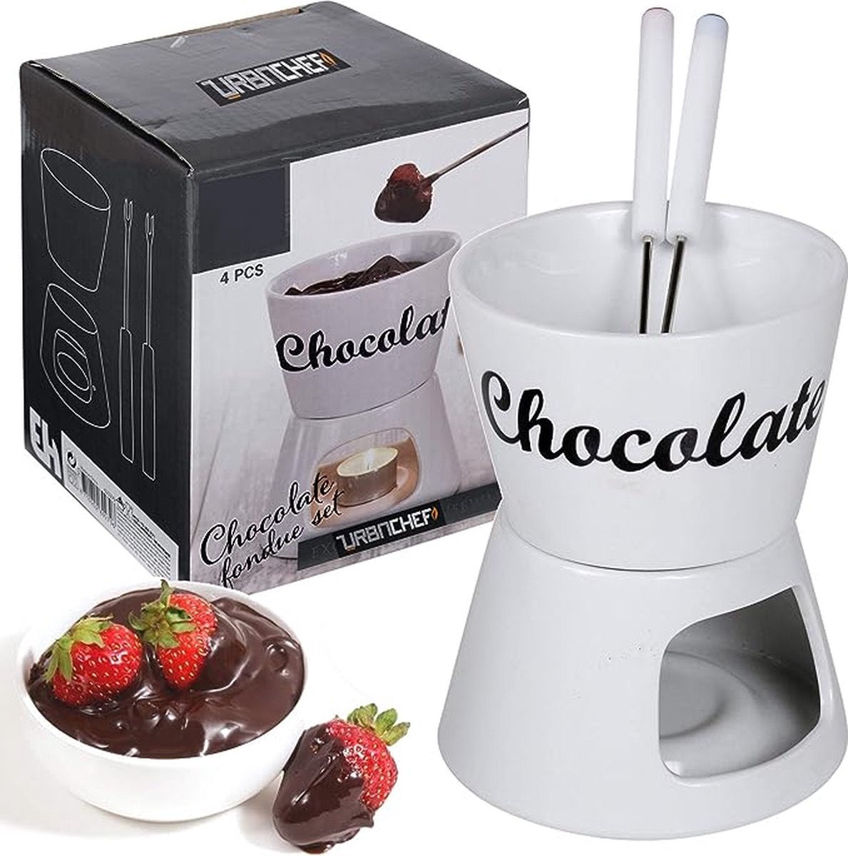 Deze Chocolade Smeltpot biedt de perfecte manier om van heerlijke gesmolten chocolade te genieten en je favoriete lekkernijen te dippen. Deze keramische fondue set wordt verwarmd door een theelicht, waardoor je op een eenvoudige en sfeervolle manier kunt genieten van gesmolten chocolade.