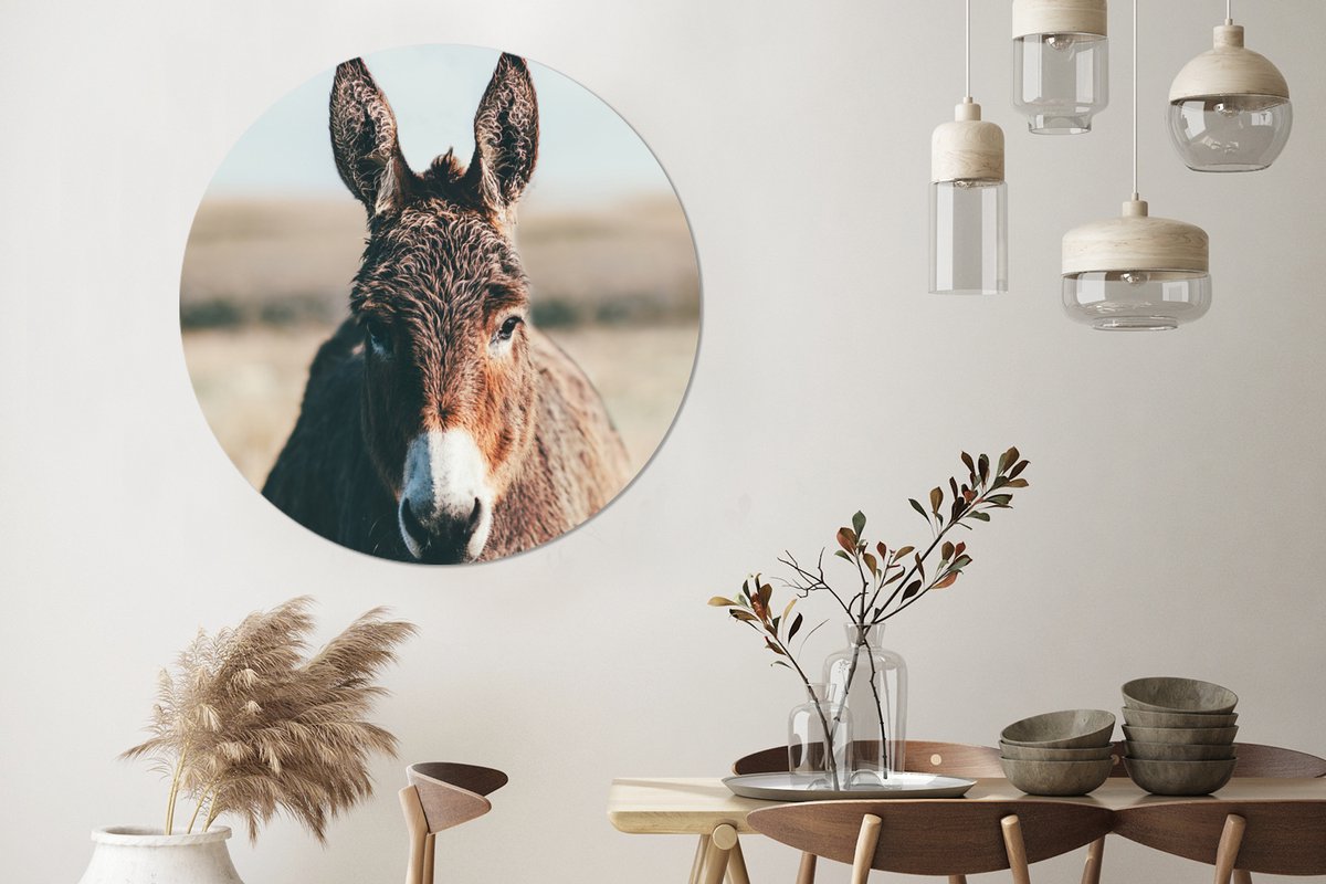 Wanddecoratie rond – Ezel – Inductie beschermer – Kookplaat – Portret – Muurcirkel binnen Muurcirkels van WallCircle geven een stoere en industriële look aan de wand van jouw woonkamer, slaapkamer, keuken of elke andere ruimte in jouw interieur of kantoor. Dit ronde schilderij past als trendy ronde wanddecoratie bij al je meubels en andere woonaccessoires.