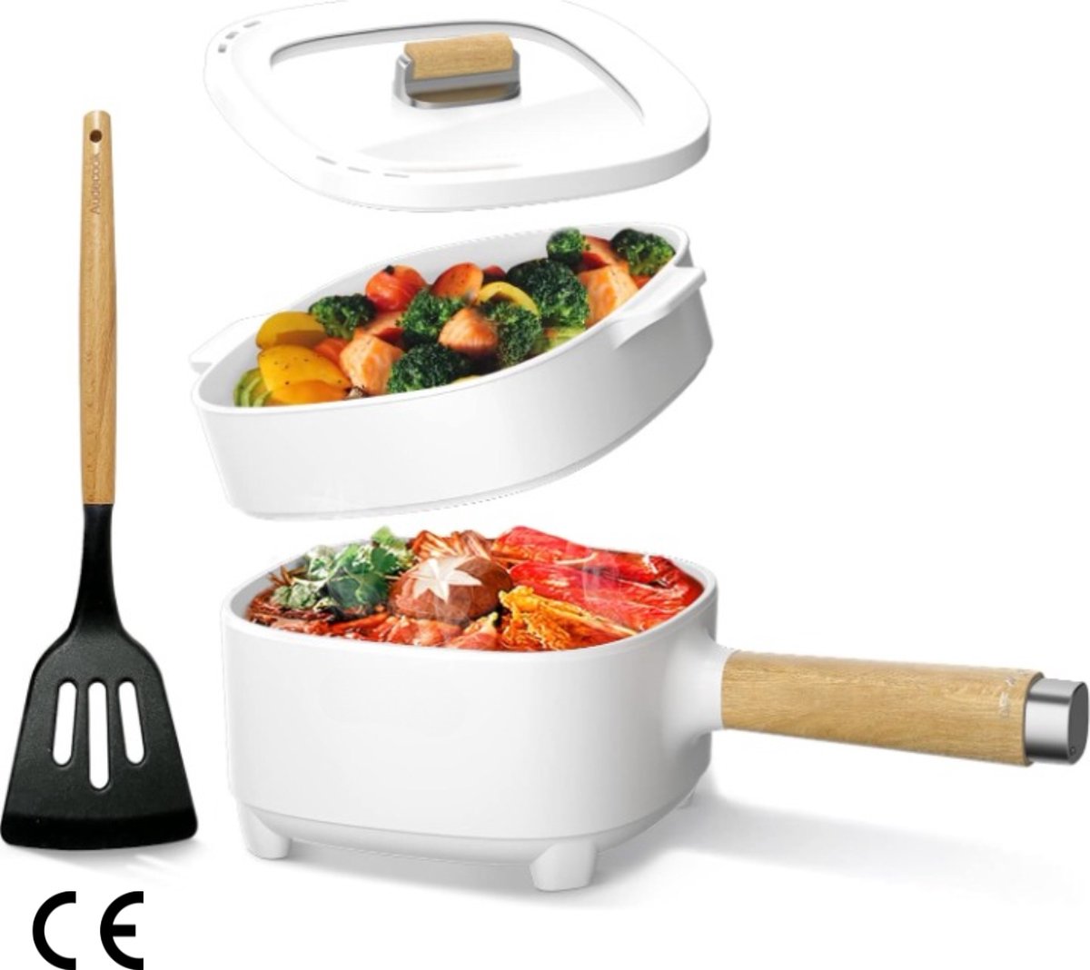 Multifunctionele Elektrische Hot Pot met Stomer: 2 L Capaciteit, 20 cm Diameter, Non-Stick Coating, Draagbaar Multicooker voor Windows, Steak, Ei, Havermout, Soep – 350 W/800 W – Wit