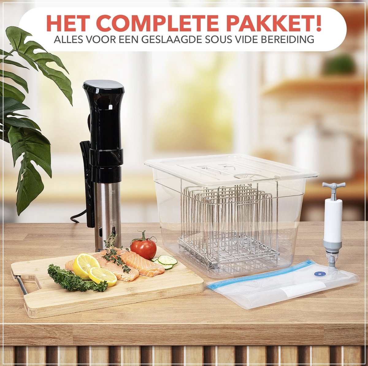 De sous vide stick wordt geleverd met essentiële accessoires voor perfecte kookresultaten. Het bijgeleverde waterreservoir en RVS verdeelrek garanderen een georganiseerde, efficiënte kookervaring. De vacuümpomp die in de set wordt geleverd is cruciaal voor sous vide koken, waarbij ingrediënten luchtdicht verpakt worden voor behoud van smaak, vocht en textuur, en een optimale warmteoverdracht. De sous vide stick en accessoires nodigen je uit om je kookkunsten te verbreden.