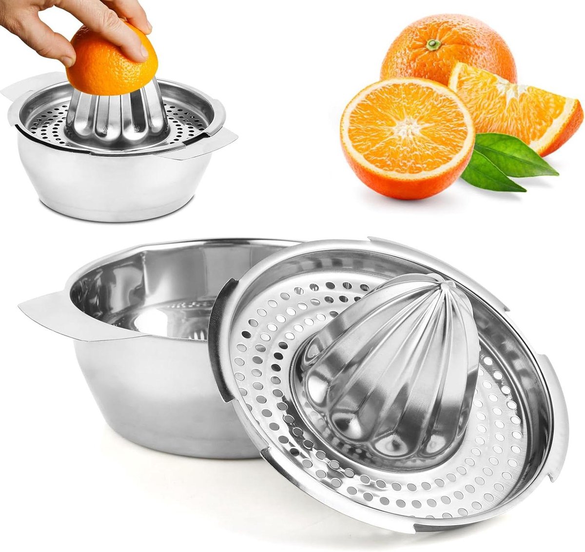 Deze roestvrijstalen citruspers heeft een ergonomisch design met een afsluitbare en afneembare zeef om zaden en pulp te voorkomen. Het is gemakkelijk schoon te maken en wordt geleverd in een prachtige verpakking, ideaal als cadeau voor geliefden.