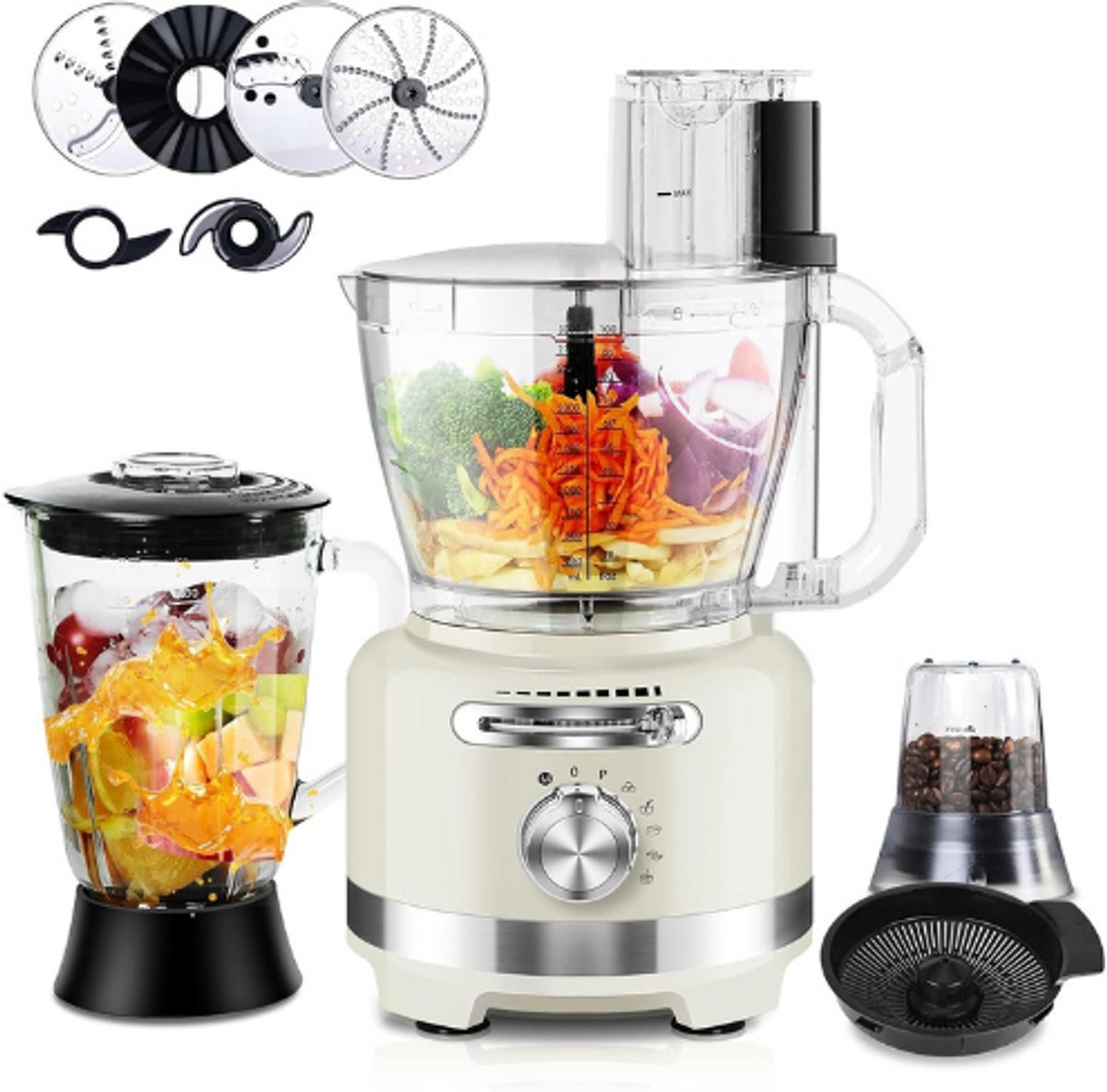 10-in-1 Elektrische Keukenmachine – 1000 W – Glazen Mixer van 1,5 L en Kom van 3 Liter – Snijden, Hakken, Raspen, Mixen, Pureren en Deeg – 6 Voorinstellingen – Voor Thuisgebruik – Wit