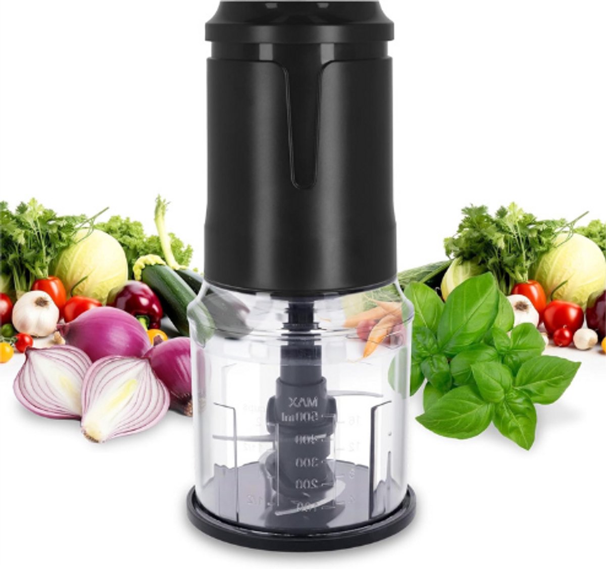 Elektrische Keukenhacker, Groentesnijder en Uiensnijder – Keukenmachine met 4 Scherpe Roestvrijstalen Messen – Multifunctionele Mixer-Hakmolen met Krachtige Motor van 400 Watt – 500 ml Capaciteit