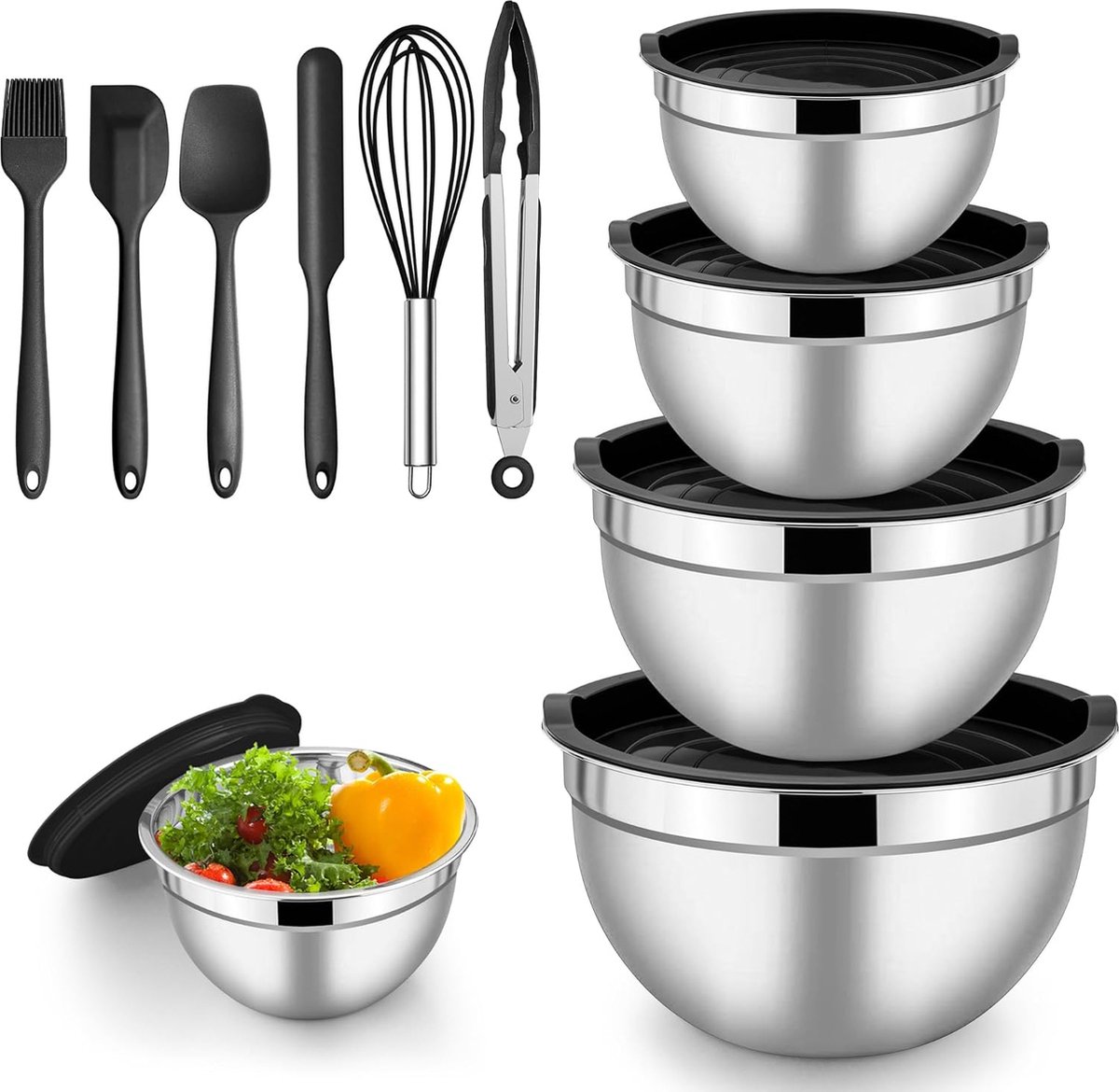 Kom met deksel, RVS saladeschaalset van 5, grootte 4.5L/2.7L/1.5L/1.2L/0.7L, stapelbare mengkom voor keukenmixen en serveren, inclusief bakaccessoires, vaatwasmachinebestendig.