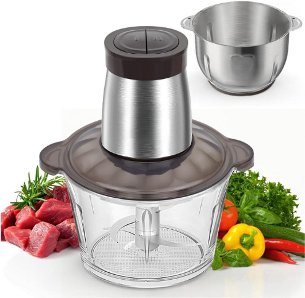 Met een vermogen van 600 W is deze hakmolen krachtig genoeg om snel door verschillende ingrediënten te snijden en te malen. Het apparaat heeft een 2 liter glazen container en een 1,8 liter roestvrijstalen container, wat betekent dat je voldoende capaciteit hebt om grote hoeveelheden ingrediënten in één keer te verwerken. Dit maakt het ideaal voor het bereiden van maaltijden voor je gezin of het voorbereiden van maaltijden voor de week.