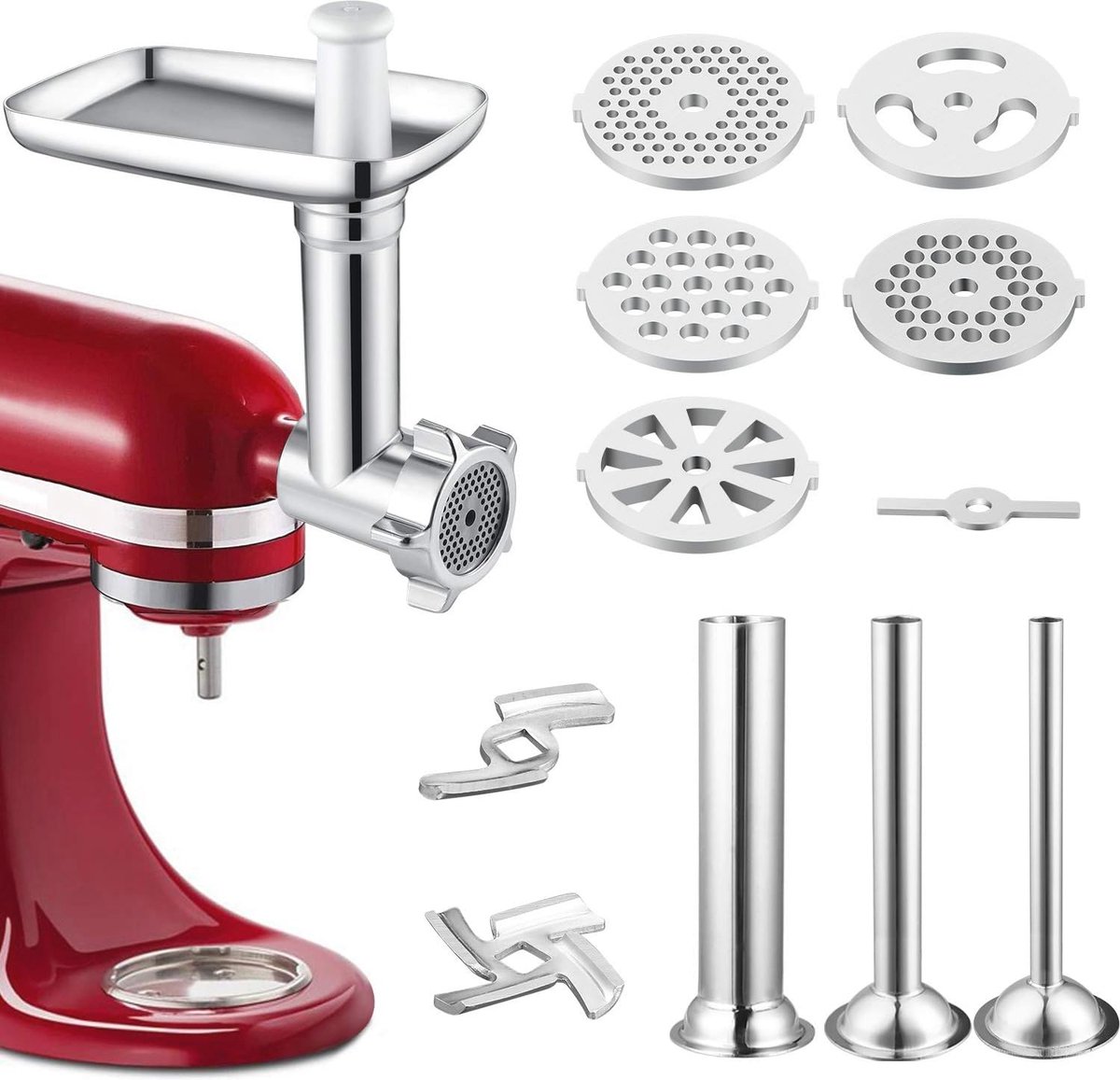 Ontdek het vleesmolen opzetstuk gemaakt van duurzaam metaal ideaal voor diverse keukenmachines. Dit handige accessoire wordt geleverd met drie verschillende worstvullers twee maalmessen en vijf maalschijven waardoor je gemakkelijk zelf vlees groenten en zelfs harde kazen kunt malen. Perfect voor het maken van hamburgers en verse worst dit opzetstuk is eenvoudig te bevestigen en te verwijderen van de power-hub van je keukenmachine. Geniet van een gezonde en verantwoorde keukenervaring met dit voedselveilige product. Let op: De verpakking bevat geen keukenmachine. Eenvoudig te reinigen met warm water en de meegeleverde borstel.