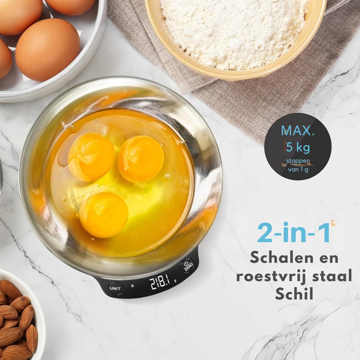 Geïntegreerde tarrafunctie – je kunt meerdere ingrediënten in één kom toevoegen zonder opnieuw te wegen, wat tijd bespaart en fouten voorkomt.