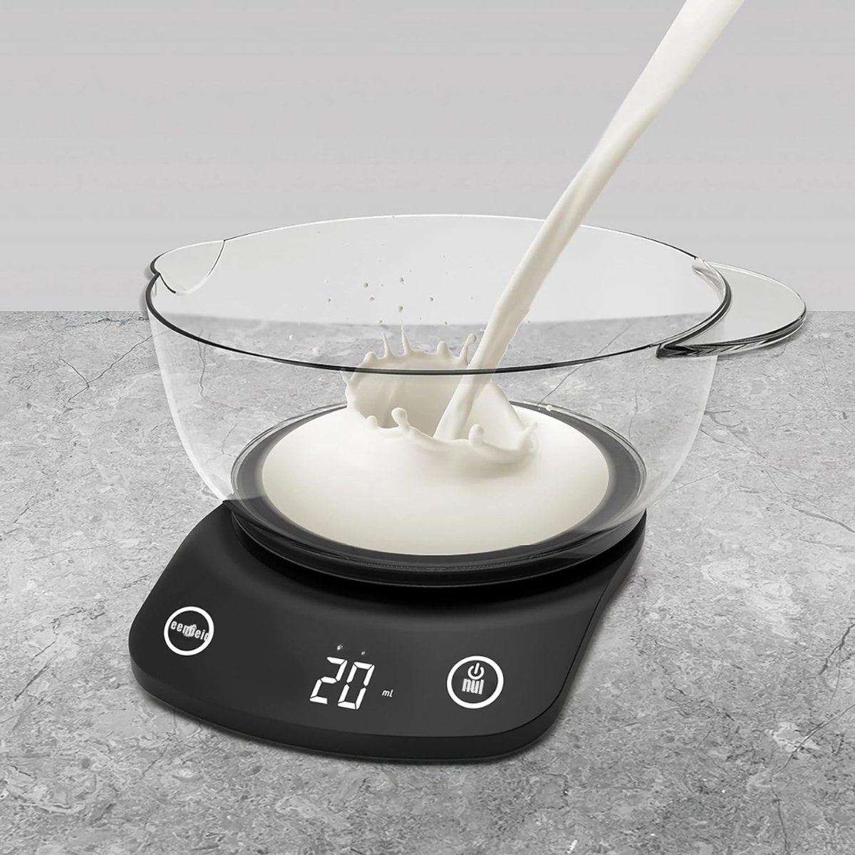 Praktisch en Stijlvol De meegeleverde afneembare kom maakt het wegen van ingrediënten eenvoudig en hygiënisch. Dankzij het moderne zwarte design past deze weegschaal perfect in elke keuken. Het duidelijke digitale display zorgt ervoor dat je met één blik precies ziet wat je nodig hebt. Praktisch gemak gecombineerd met een stijlvolle uitstraling.