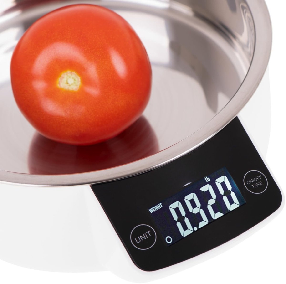Zet de roestvrijstalen bak op de weegschaal en schakel deze in.