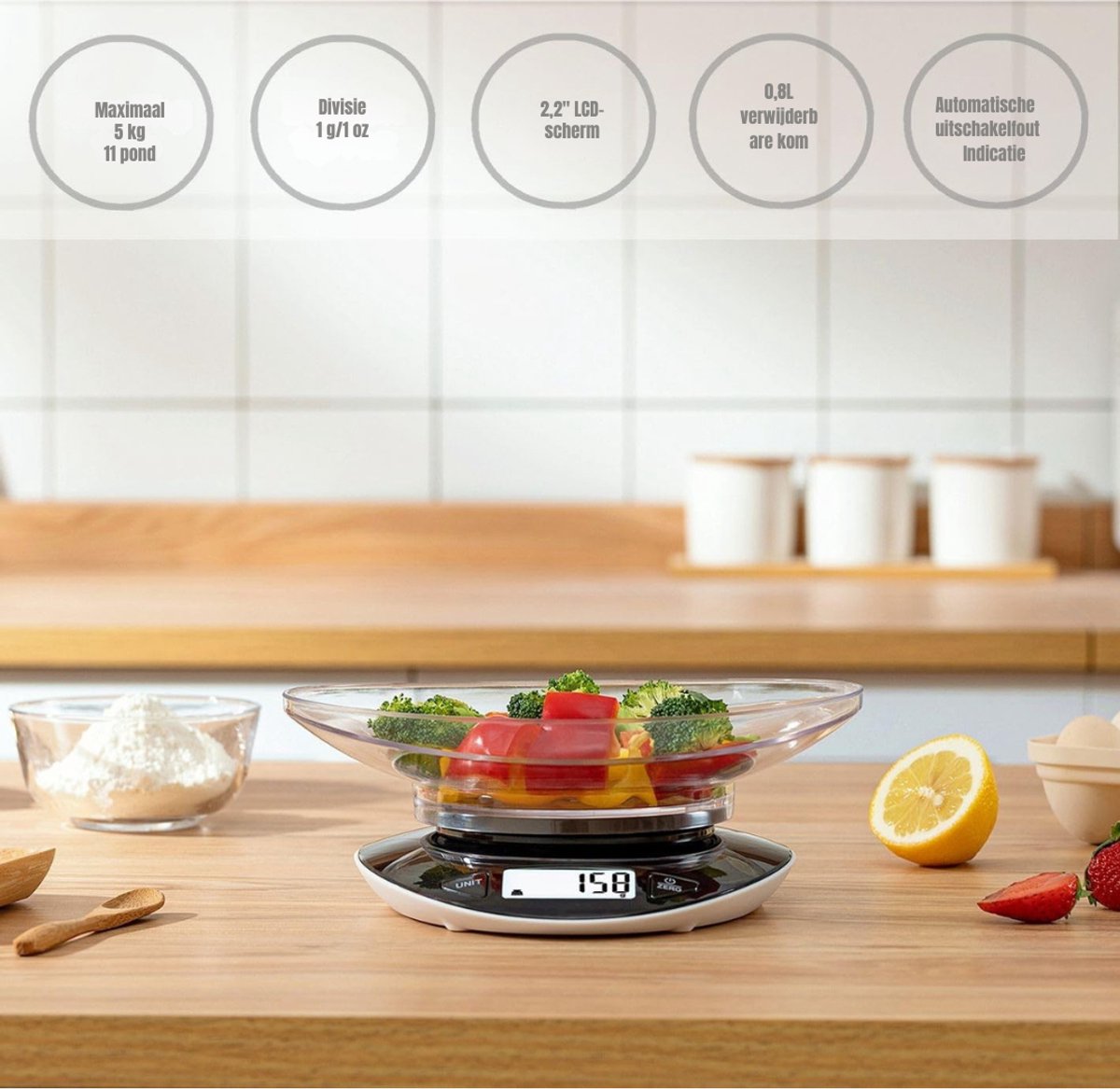 Praktisch en overzichtelijk design Het duidelijke LCD-display zorgt ervoor dat je met één blik ziet wat je afweegt. De meegeleverde kom maakt mengen en wegen tegelijk mogelijk, wat tijd en afwas bespaart. Dankzij het slimme ontwerp is de weegschaal eenvoudig op te bergen, zelfs in kleine keukens. Alles is ontworpen om jouw kookmoment soepeler te laten verlopen. Zo wordt elke bereiding leuker.