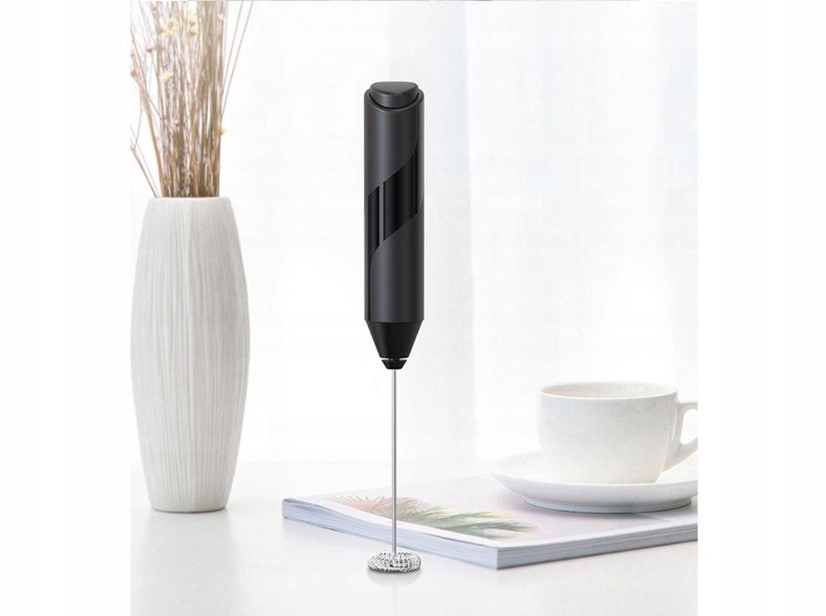 De melkopschuimer heeft een prachtige vorm in zwarte kleur en past in elke moderne keuken. Het is lichtgewicht en heeft een ergonomisch ontworpen soft touch-handvat. De aan/uit knop bovenaan is gemakkelijk te gebruiken en de motor maakt nauwelijks geluid terwijl hij zo’n 200 keer draait in een seconde! De mixer werkt op batterijen, zodat u zich geen zorgen hoeft te maken over snoeren en stopcontacten. Dankzij de compact elektrisch ontwerp, kan de schuimer zowel staand op de aanrecht of op een tafel worden bewaard en mooi lijken naast andere koffie-accessoires, als in een lade als je dat leuker vindt.