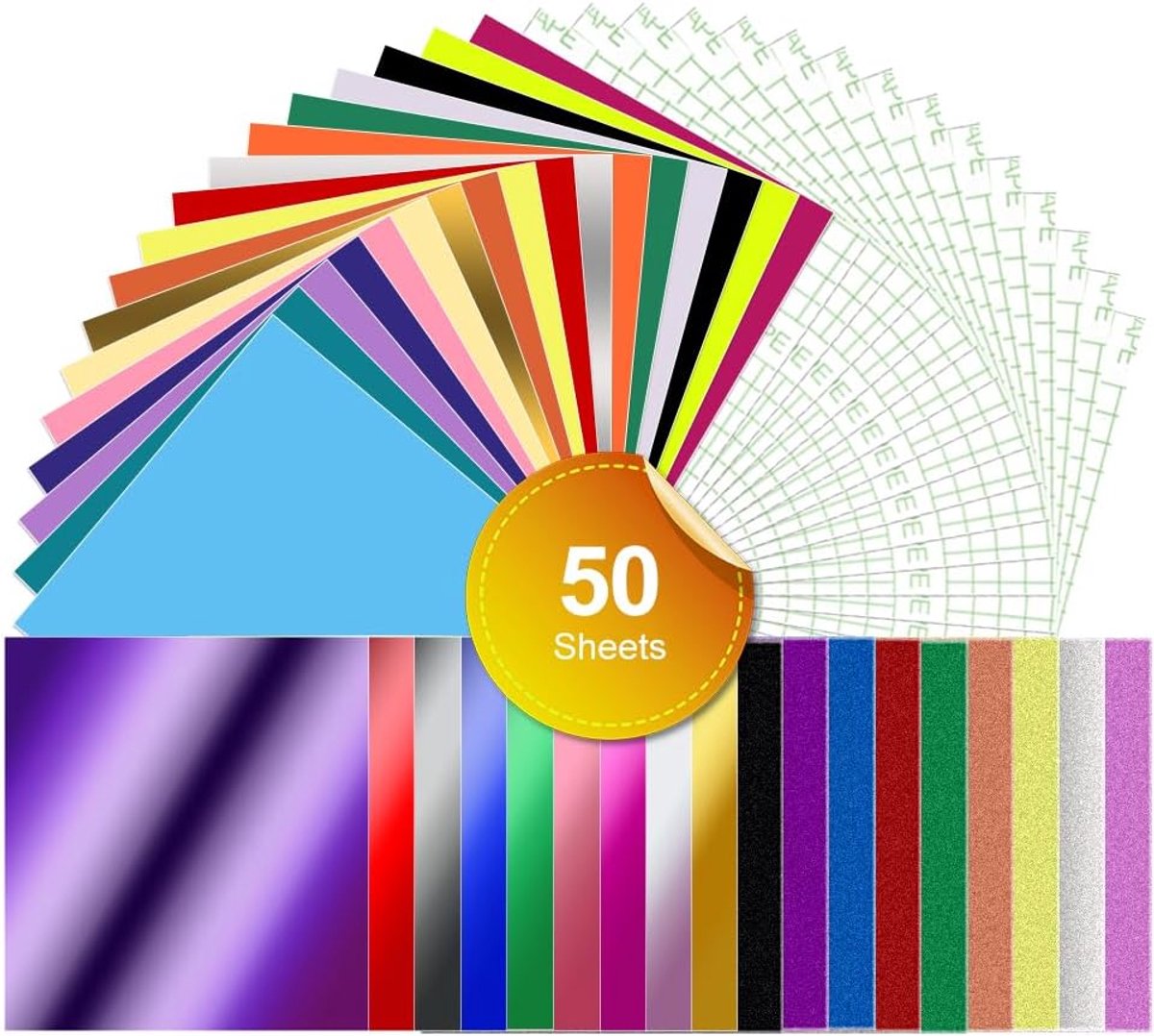 Grote set van 50 vellen permanent zelfklevend vinyl, inclusief diverse effen kleuren, glitter vinyl en chroom spiegelende afwerkingen. Dit Smart vinyl is ideaal voor plotters en snijmachines en meet 33 x 30,5 cm. Dankzij de zelfklevende eigenschappen is geen snijmat vereist bij gebruik met compatibele machines. Het materiaal is duurzaam, waterdicht en vervaagt niet, waardoor het geschikt is voor zowel binnen- als buitengebruik op oppervlakken zoals glas, metaal, hout en plastic. Perfect voor het personaliseren van kopjes, ramen, auto’s, muren en decoraties. Deze set bevat ook 15 vellen transferfolie voor een eenvoudige overdracht. De vinylfolie is gemakkelijk te snijden en ‘onkruid’ te verwijderen.