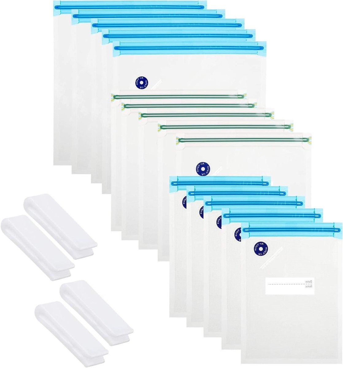 De set wordt geleverd met kleine, middelgrote en grote maten, in totaal 15 vacuüm verzegelde zakken voor het bewaren van levensmiddelen en sous-vide koken. Daarnaast zijn er 4 clips inbegrepen om aan al je behoeften op het gebied van voedselopslag en koken te voldoen.