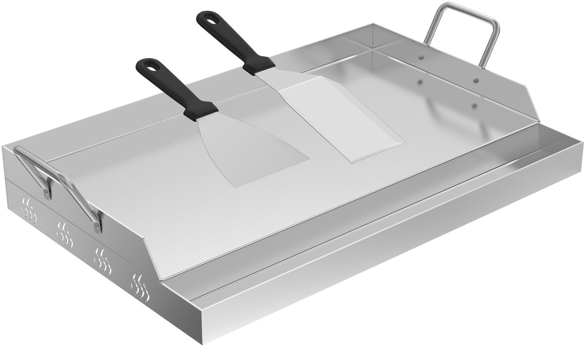 Deze hoogwaardige roestvrijstalen grillplaat is de ideale aanvulling voor in de keuken, op de barbecue of buiten. Hij is gemaakt van roestvrij staal dat geschikt is voor levensmiddelen en heeft een bijzonder robuuste, hittebestendige en duurzame constructie. Het doordachte ontwerp, de geïntegreerde vetafvoer en de twee meegeleverde grillspatels garanderen een schone, efficiënte en gezonde grillervaring – waar u hem ook gebruikt.