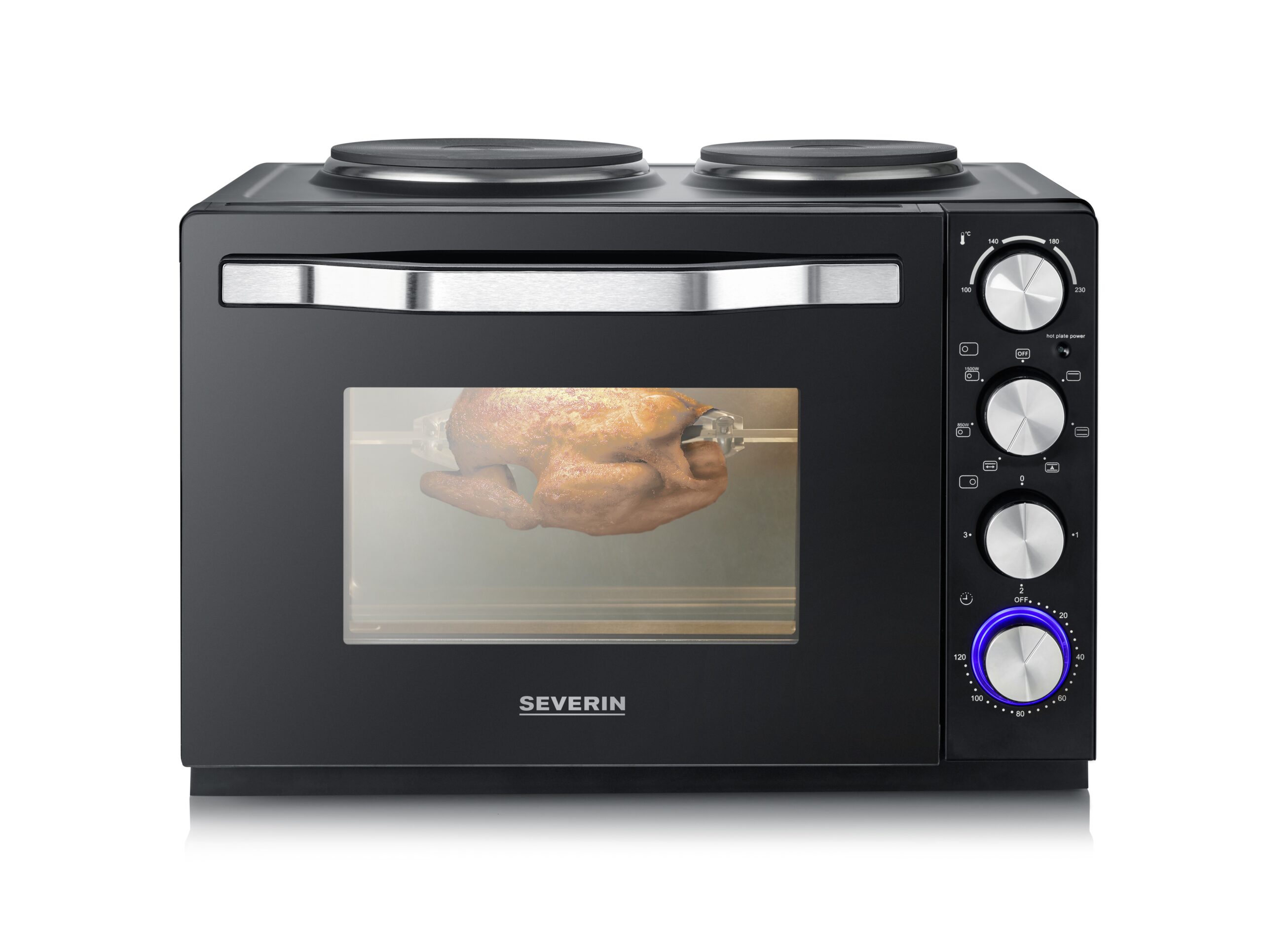 De Severin TO2074 is een compacte combinatie van een volwaardige oven met twee kookplaten voor koken, grillen en bakken. Dankzij de grillfunctie met het meegeleverde draaispit en de roterende aandrijving is het de bereiding van gegrilde kip heel makkelijk.