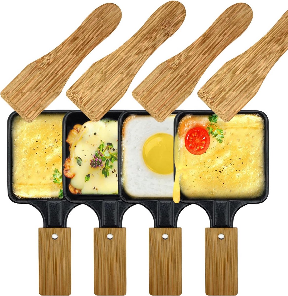 Set van 4 Mini Koekenpannen met Bamboe Handvat – Non-Stick Voorstrijkpannen & Raclette Accessoires