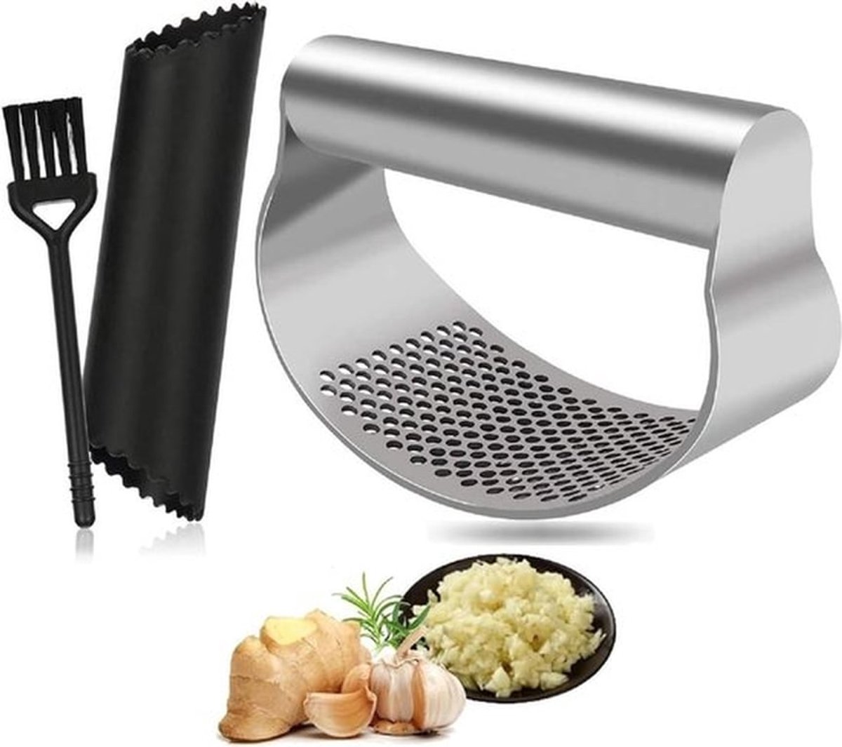 Knoflookpers – Roestvrij staal knoflookpers met schiller en kwast