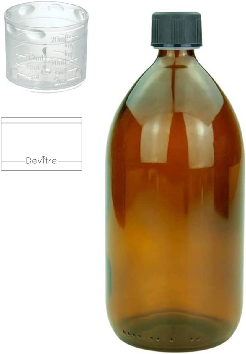 Deze stevige bruine glazen fles heeft een inhoud van 1000 ml (1 liter) en is ideaal voor opslag in het laboratorium, apotheek of thuis. De fles wordt geleverd met een veiligheidsschroefdop van kunststof, inclusief kinderslot. Afmetingen: hoogte 21,7 cm, Ø 9,75 cm, opening Ø 2 cm. Inclusief een handige maatbeker met duidelijke maataanduidingen (2 ml tot 20 ml) die perfect op de fles past. Daarnaast ontvangt u een blanco zelfklevend etiket om de inhoud eenvoudig te beschrijven. Perfect voor het bewaren van vloeistoffen waarbij lichtbescherming gewenst is.