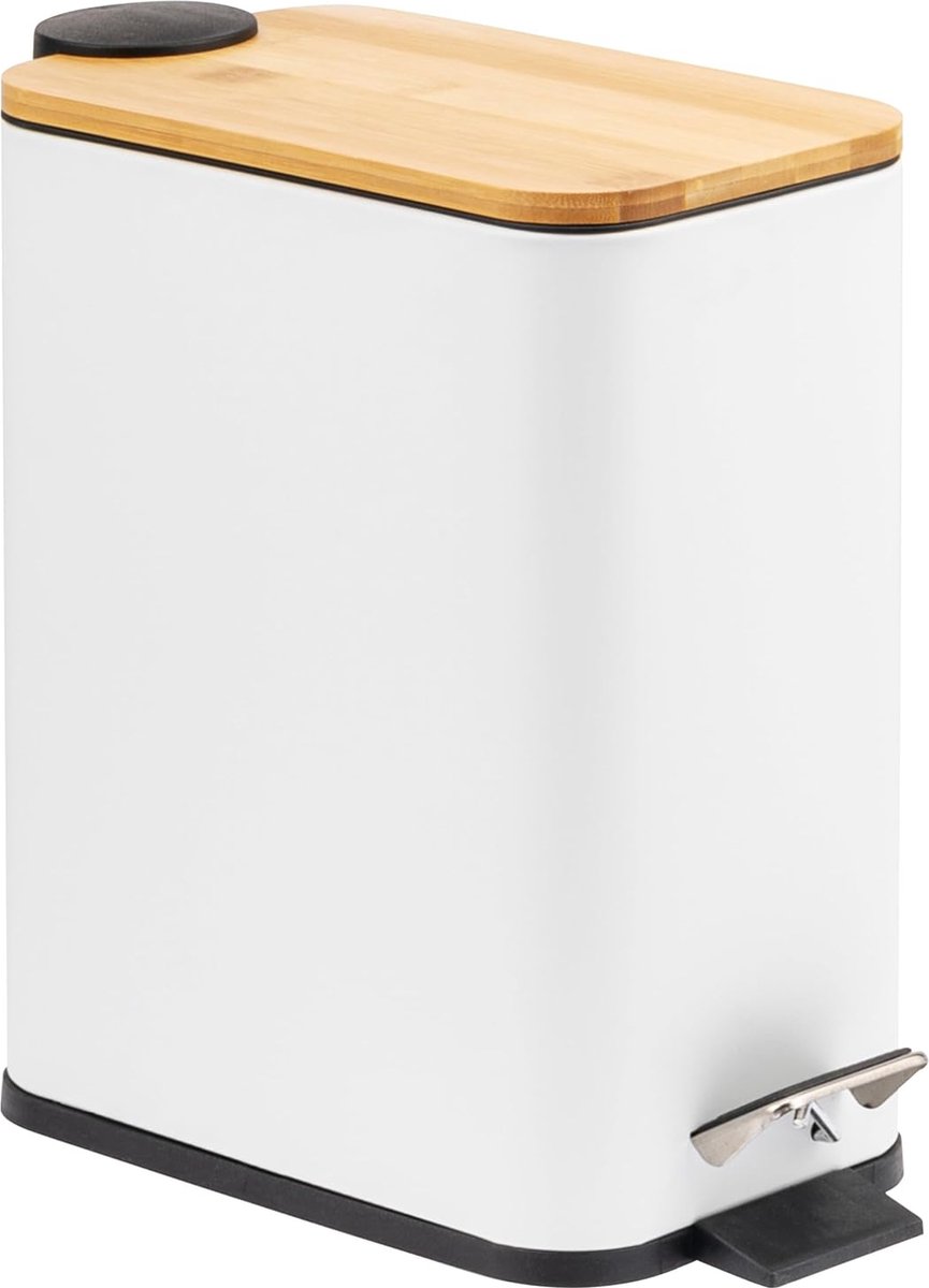 Bamboe design: deze elegante combinatie van gekleurd lichaam, bamboedeksel en het brede voetpedaal is zeer elegant. De design-vuilnisemmer maakt van de eenvoudige vuilnisemmer voor je huis een echte blikvanger. Bijzonder praktisch is de smalle vorm, omdat hij zo ook in elke nis past. De natuurlijk warme tint van bamboe brengt een echte feel-good sfeer in je badkamer, keuken en elke andere ruimte. Veel plezier ervan