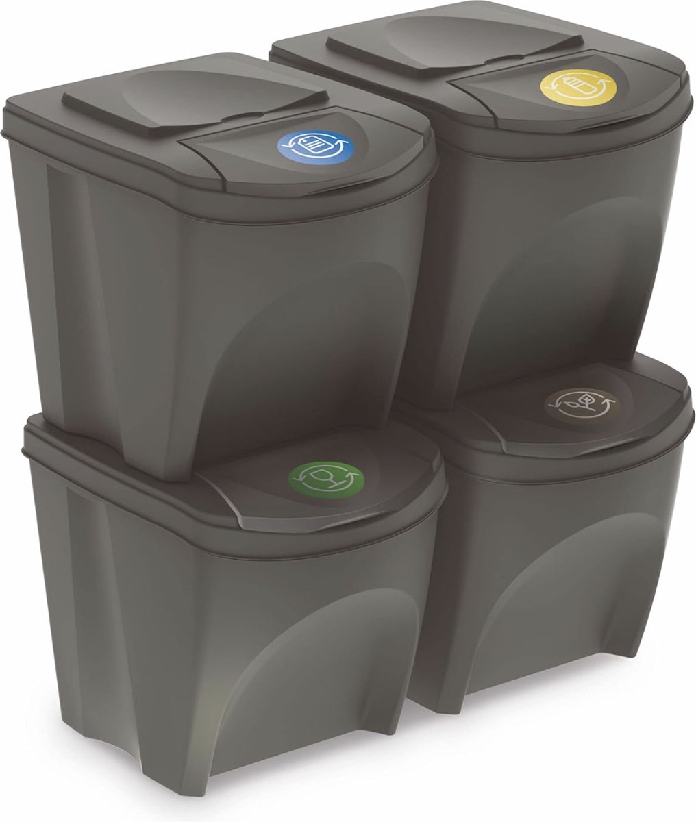 Afvalemmer met deksel, 25 liter, set van 4, steengrijs, stapelbaar afvalscheidingssysteem, afvalsorteerder, scheidingssementen, stapelbaar met klep