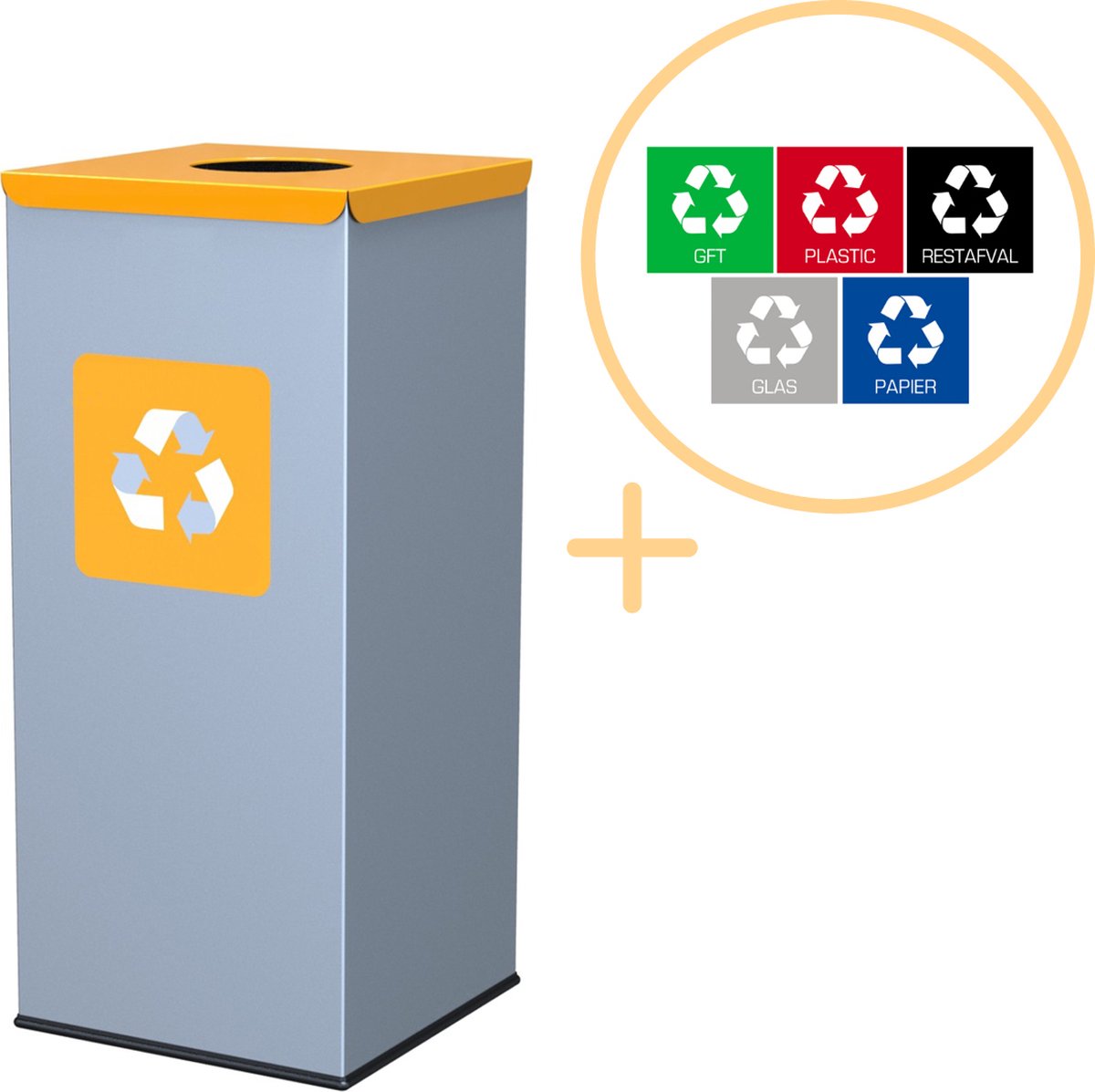 Alda Eco Square Bin, Prullenbak – 60L – Grijs/Geel – Afvalscheiding Prullenbakken – Gemakkelijk Afval Scheiden – Recyclen – Afvalemmer – Vuilnisbak voor huishouden en kantoor – Afvalbakken – Inclusief 5-delige Stickerset