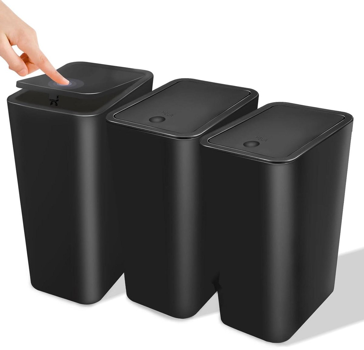Premium – Set van 3 vuilnisemmers met deksel 10 liter voor badkamer, slaapkamer, keuken, kantoor en toilet – Moderne afvalemmers in zwart design