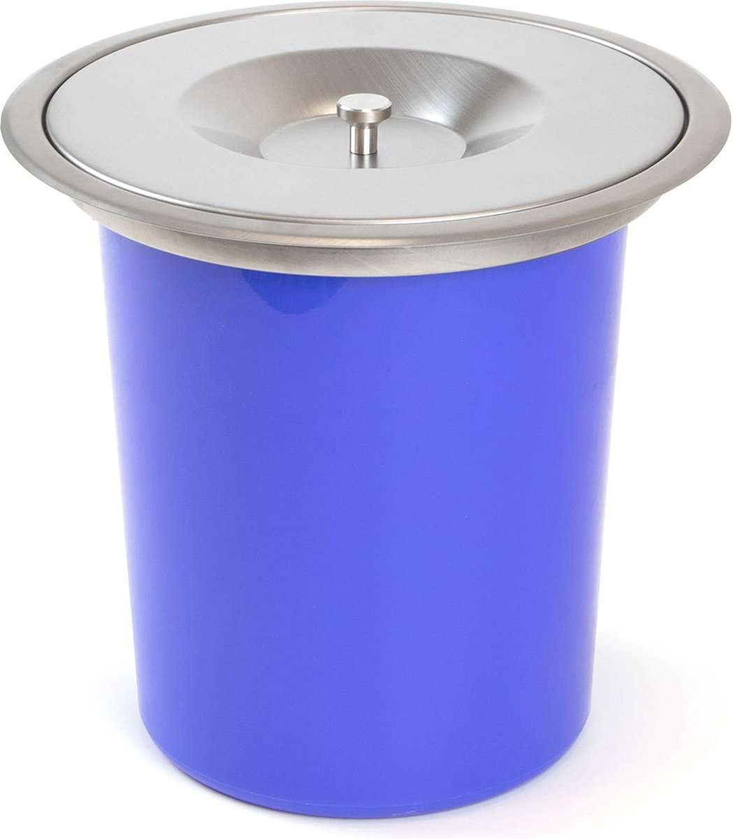 Deze praktische verzonken vuilnisemmer voor het aanrechtblad heeft een inhoud van 6 liter en is ideaal voor de keuken. Hij is voorzien van een deksel en vereist een minimale binnenruimte van 270 mm. Met een hoogte van 265 mm en een buitenste ring diameter van Ø 270 mm is hij perfect voor verschillende werkbladen. De benodigde boring in het meubelstuk heeft een diameter van 210 mm. De stabiliteit wordt gegarandeerd door de ringen waardoor vuilniszakken gemakkelijk kunnen worden geplaatst en vastgehouden. Gemaakt van duurzaam blauw kunststof en roestvrij staal is deze vuilnisemmer zowel functioneel als esthetisch aantrekkelijk.
