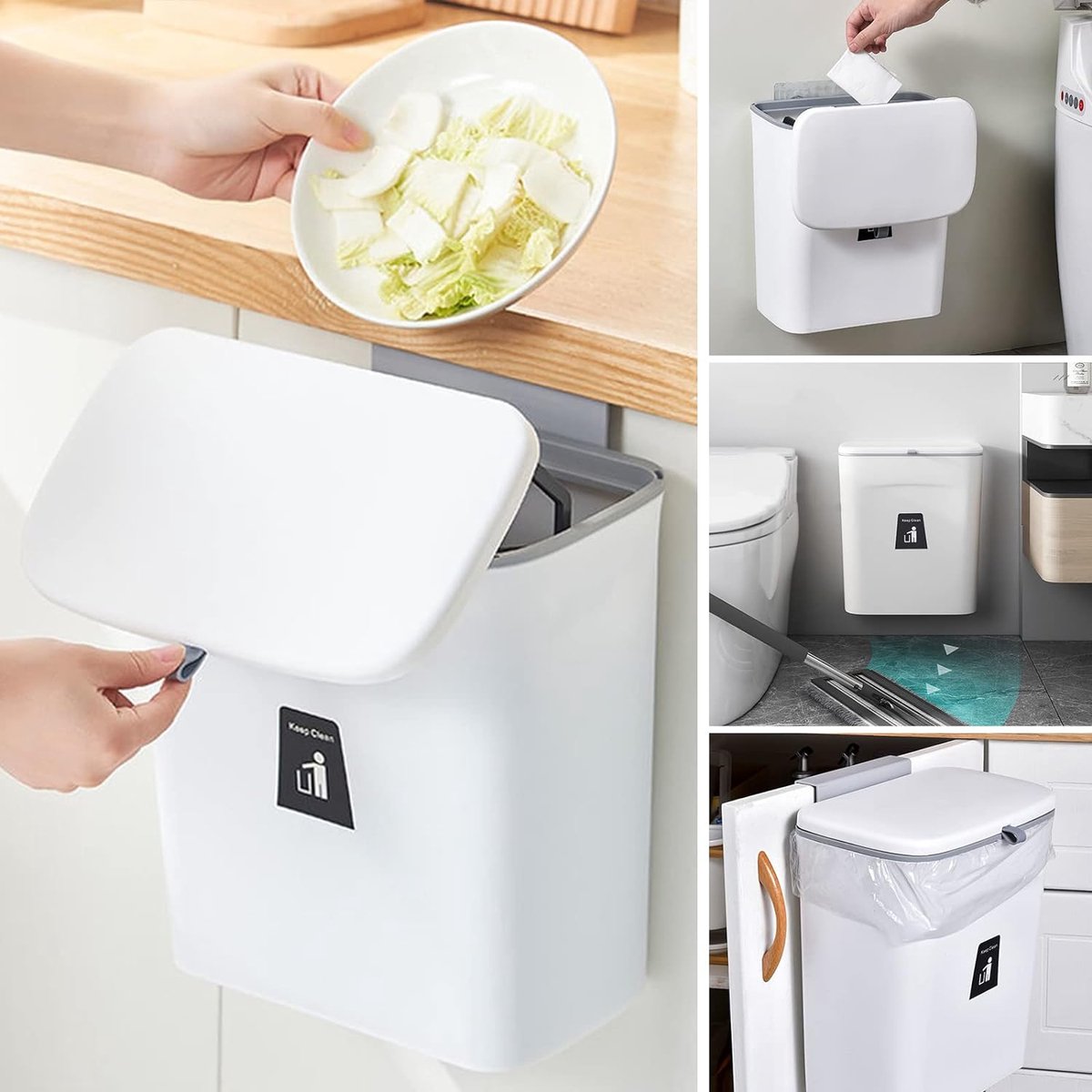 Home Opruimen & Bewaren Afvalemmers Vuilnisemmer met deksel, 9 liter, kleine hangende afvalemmer, wandmontage, plastic, compostemmer, geurdichte afvalcontainer voor deur om op te hangen, voor camper, keukenkast (wit)