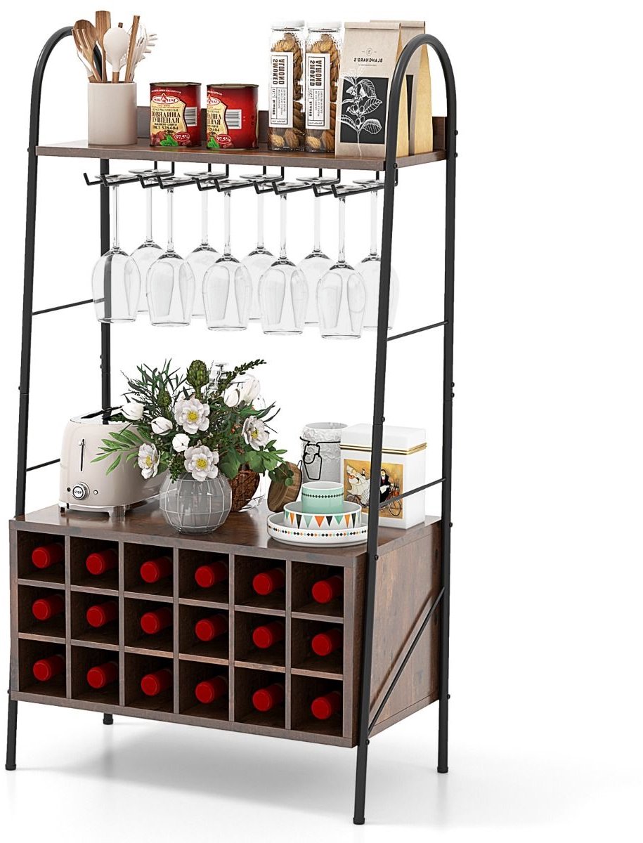 Dit stijlvolle wijnrek in rustiek bruin is dé oplossing voor het overzichtelijk opbergen van je wijncollectie en wijnglazen. Ideaal voor liefhebbers die hun keuken, eetkamer, woonkamer of bar willen verfraaien met een praktische én decoratieve toevoeging. Met ruimte voor 18 wijnflessen en 15 glazen biedt dit rek volop opbergcapaciteit. De ruime toonbank en extra plank zorgen bovendien voor veelzijdige opbergmogelijkheden, terwijl het stevige metalen frame en slimme veiligheidsvoorzieningen garant staan voor stabiliteit en duurzaamheid.