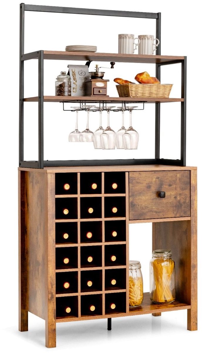 Deze multifunctionele keukenopbergkast in bruin met zwart metalen accenten is de ideale oplossing voor wie stijl en functionaliteit wil combineren. Met drie ruime planken, een handige lade en een open bodemvak biedt dit rek volop ruimte voor keukengerei, voorraad of servies. Het ingebouwde wijnrek biedt plaats aan maar liefst 18 flessen en 6 wijnglazen. Dankzij het slanke ontwerp van 74 x 40 cm past het moeiteloos in de keuken, woonkamer of eetkamer en dient het perfect als magnetronstandaard, bar of displaykast.