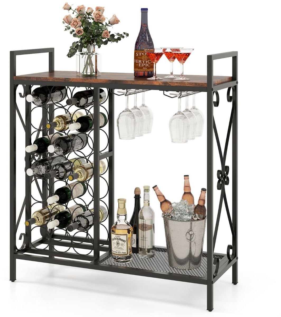 Het wijnrek in rustiek bruin combineert praktische opbergruimte met een stijlvolle uitstraling en is een ideale keuze voor wijnliefhebbers. Met ruimte voor 21 flessen en 6 glazen biedt het niet alleen een functionele opslagoplossing, maar verhoogt het ook de sfeer in elke keuken, eetkamer of entertainmentruimte. Het ruime werkblad van 93 x 38 cm is ideaal voor het uitschenken of presenteren van drankjes en laat zich makkelijk reinigen.