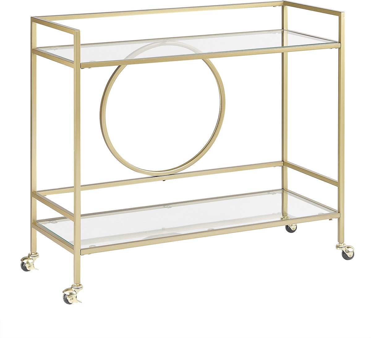 Schitterende metalen barwagen met wielen. Extra decoratief en flitsend, deze glamour-barwagen zal de perfecte feestgenoot zijn. Het gouden metalen frame wordt gecombineerd met twee glazen oppervlakken, wat het stuk een elegante uitstraling geeft en tegelijkertijd praktisch in gebruik maakt. De trolley is uitgerust met vier wielen met remmen, waardoor veilig gebruik mogelijk is, zonder angst voor wegrollen.