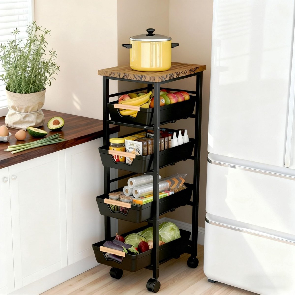 CHIWIN Keukentrolley op Wieltjes – 5-Lags Smalle Serveerwagen – 4 Laden & Houten Blad – Keuken Trolley met Uittrekbare Geventileerde Manden – Trolley Badkamer – Sterke Staalconstructie – voor Keuken, Woonkamer, Badkamer, Slaapkamer – Zwart