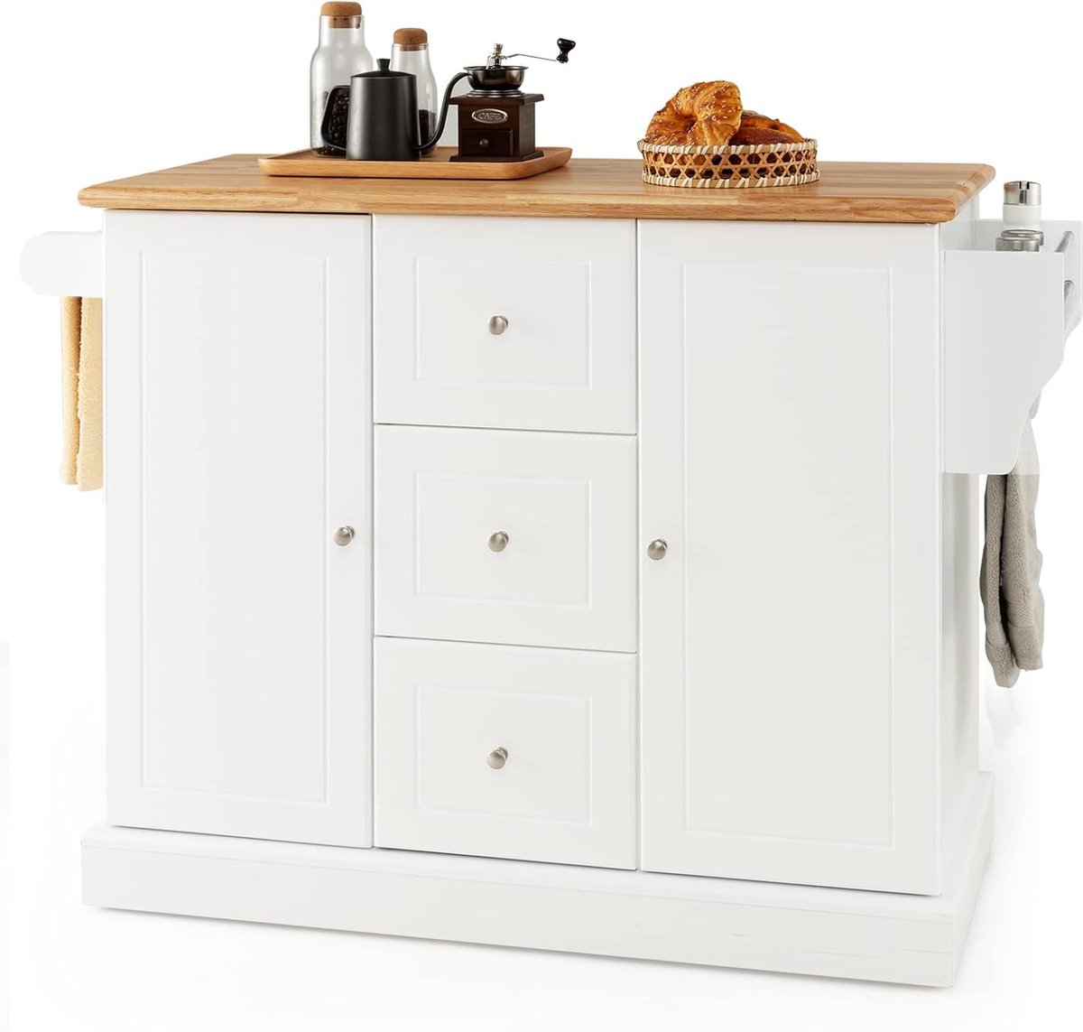 Keukenkast van hout, keukeneiland met 5 verborgen wielen, keukentrolley met werkblad, handdoekhouder & 3 laden, 5-traps verstelbare planken, serveerwagen, sideboard, oprolbaar (wit)
