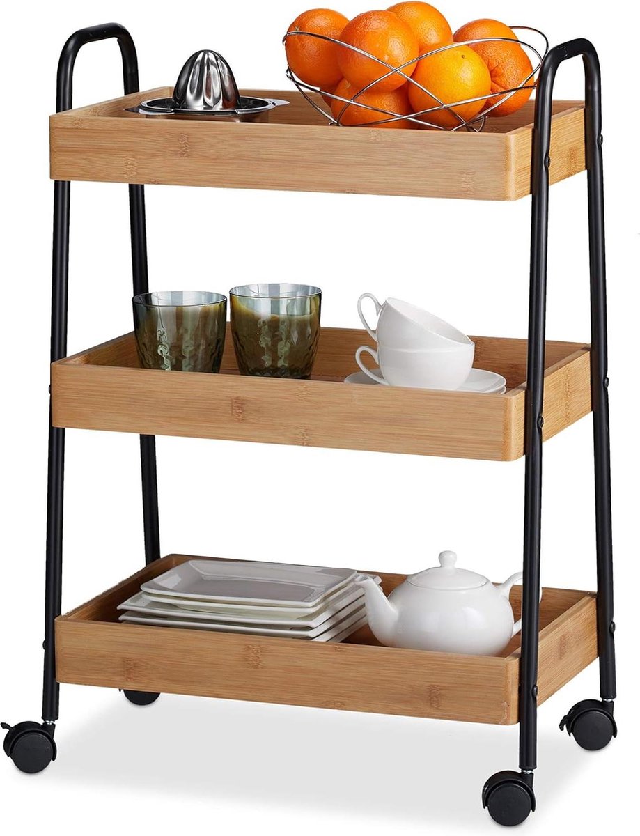 Keukentrolley 3 vakken bamboe met draaibare wielen en handgrepen – stalen frame – 70x49x28cm – natuur/zwart