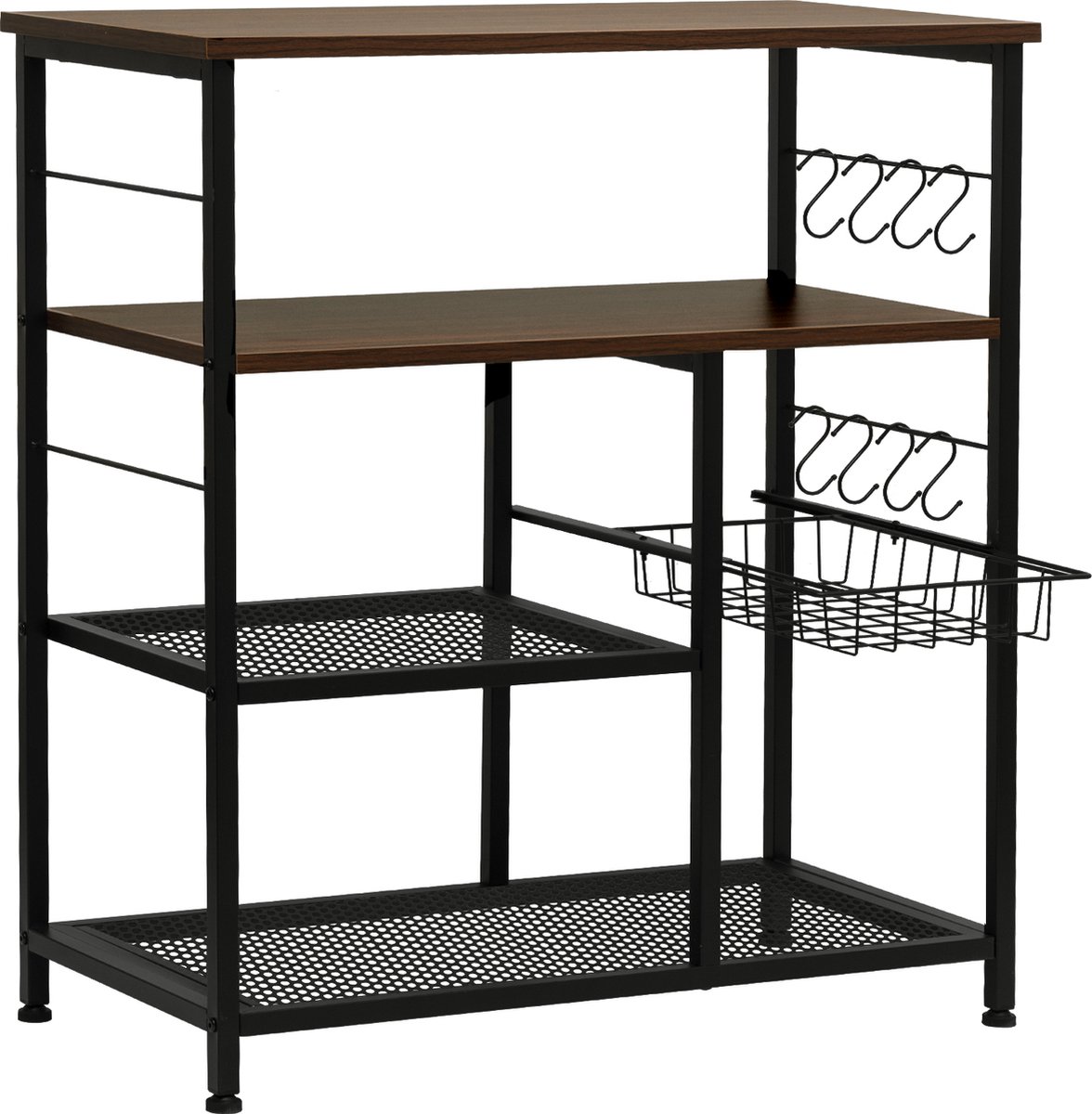 Het robuuste metalen frame van de keukentrolley is gemaakt van hoogwaardig staal en is behandeld met een zwarte poedercoating om bescherming tegen roest en slijtage te bieden. Het bruine houten blad is gemaakt van duurzaam MDF en heeft een natuurlijke houtnerf die het een warme uitstraling geeft.