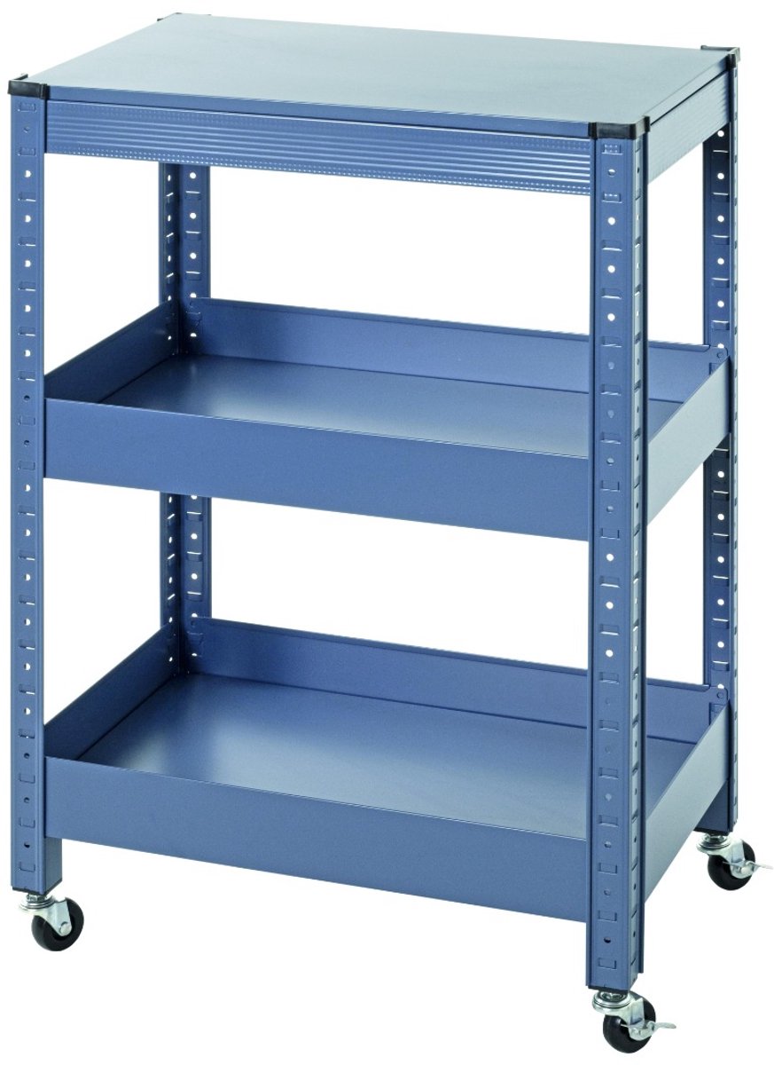 Keukentrolley – Blauw metaal met drie planken – Verrijdbare keukenwagen, modern design – 75 cm hoog, 50 cm breed, 32 cm diep